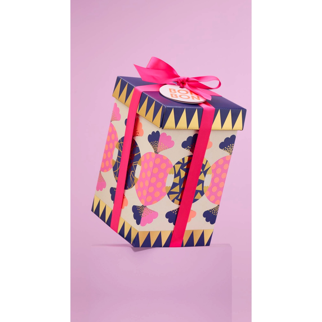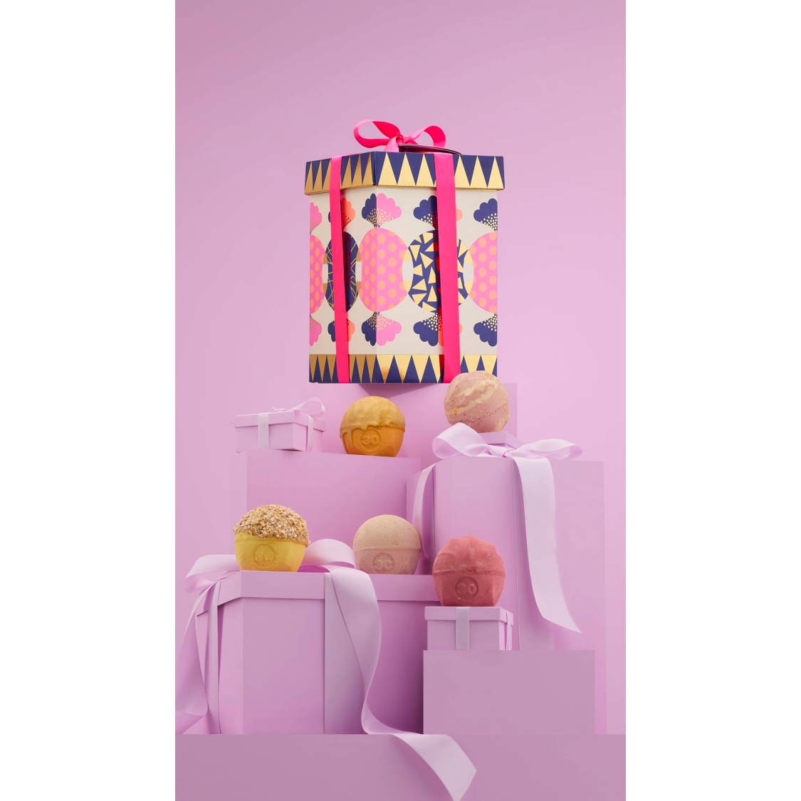 The designer of this gift, Vicki Turner, describes how, “I’ve always valued Lush’s ethical and thoughtful ethos, so to be invited to collaborate was quite the treat. I enjoyed working with the team to bring their gourmand fragrances and bonbon themes into a bold, gold and playful reality!”