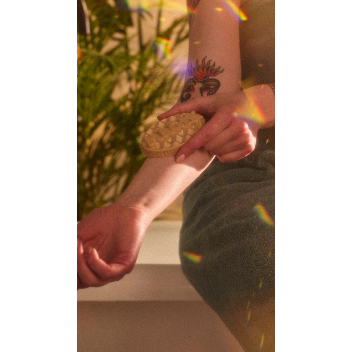 Melt the bar directly onto dry skin and massage the oils and butters in. If the bar is cold, begin by warming between your hands to melt. Lush massage bars are generously oil-rich, so apply as much or as little as desired and re-apply as needed.